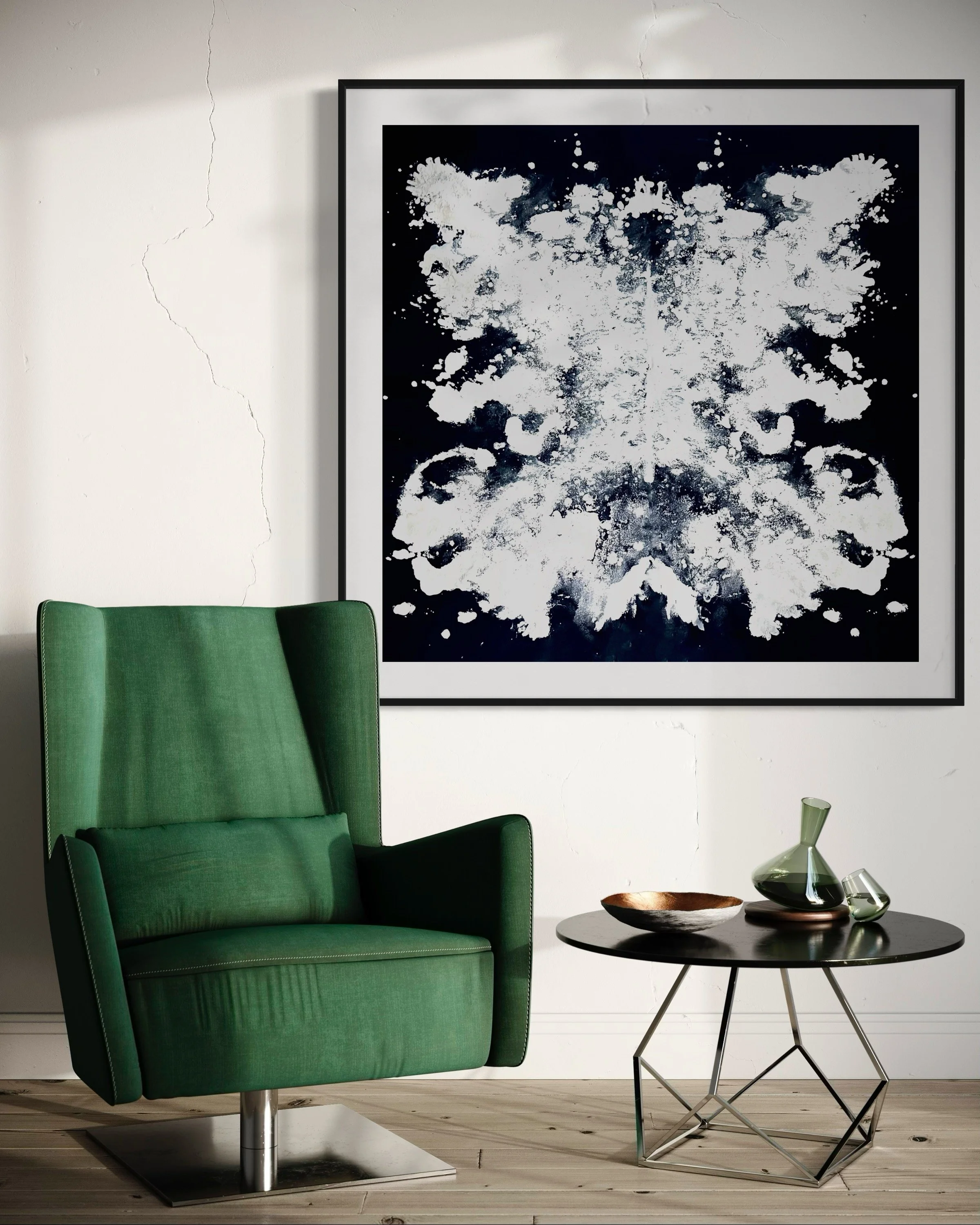 In my latest Symmetry series, I create Rorschach-inspired inkblots using both of my hands directly on canvas, engaging both sides of the brain. There are no brushes involved. Just breathwork, bare hands, and the raw transfer of emotion onto canvas. The mirrored forms might evoke wings, the horse spirit, creatures, or simply a state of mind. The symmetry is imperfect, on purpose, like in quantum physics, where broken symmetry gives birth to motion, matter, and meaning. (John Clauser, Nobel Prize of Physics taught me that!)