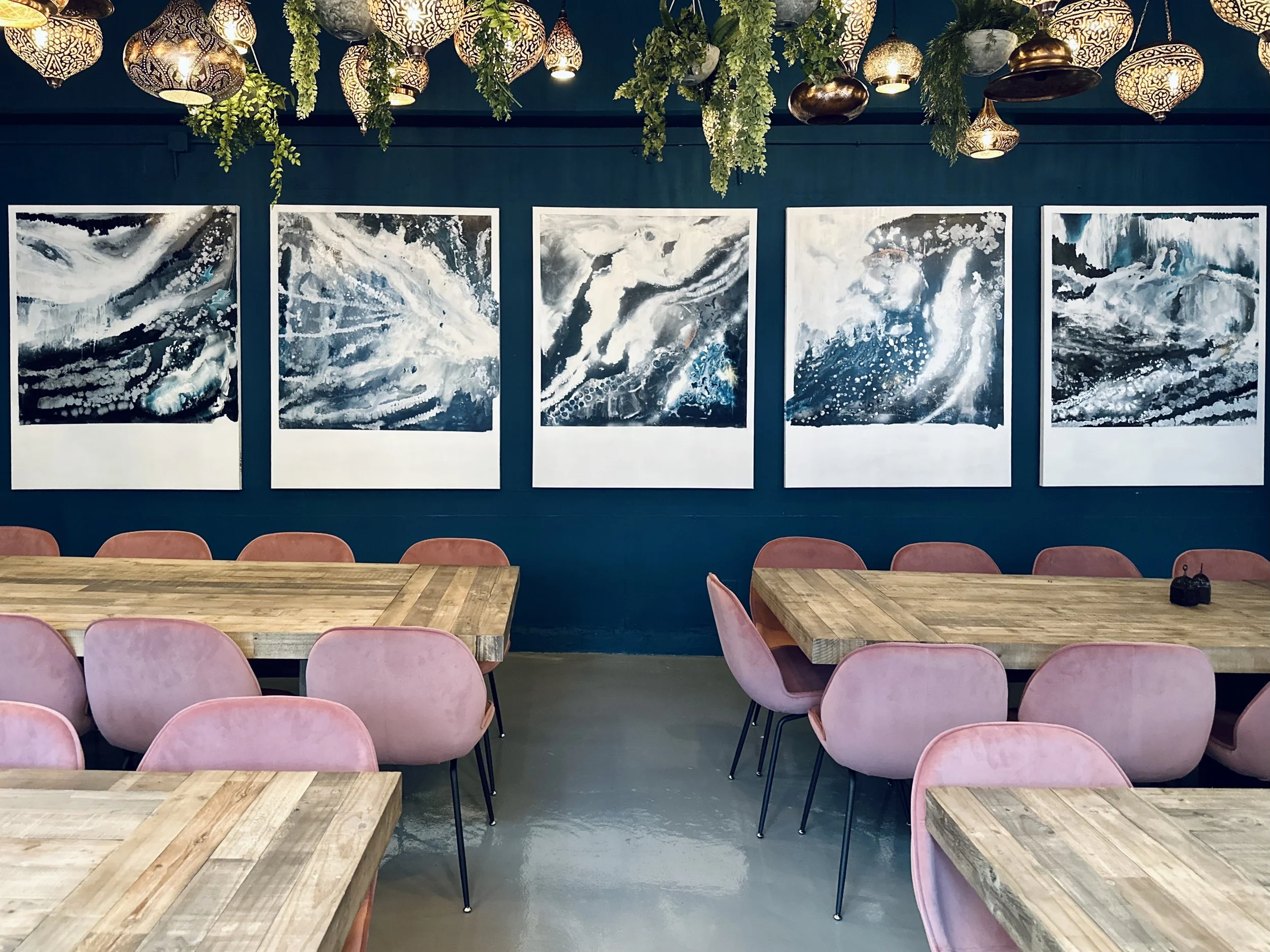 In the Whispers of the Wild series, her Blue Eternity I–V capture imagined ocean depths, fleeting bursts of color, motion, and quiet life, like Polaroids from the sea’s hidden layers.